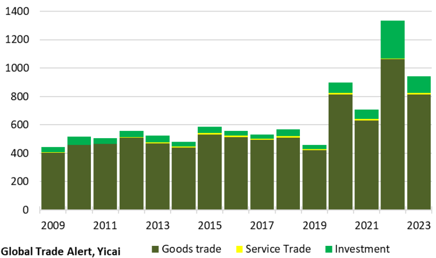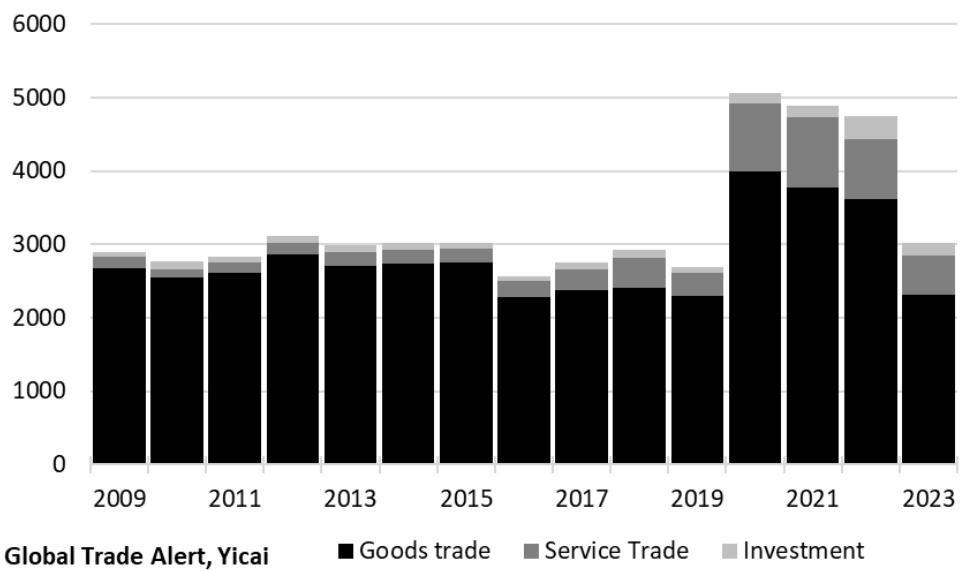 最近几年的激增很可能是由新冠疫情导致的。令人鼓舞的是,随着新冠疫情逐渐退去,政策制定者们也不再倾向于保护国内市场。2023年,这些贸易限制措施降至3000项以下。