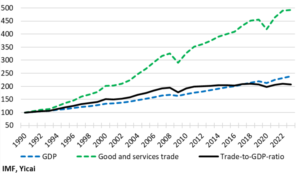 首先,虽然存在着种种说法,但国际贸易依然强劲。图1显示了过去三十多年全球国内生产总值(GDP)和贸易额的走势(2023年的数据是国际货币基金组织在2023年10月发布的《世界经济展望》中的预测值)。2023年全球贸易额预计将比新冠疫情前的峰值高出8%。