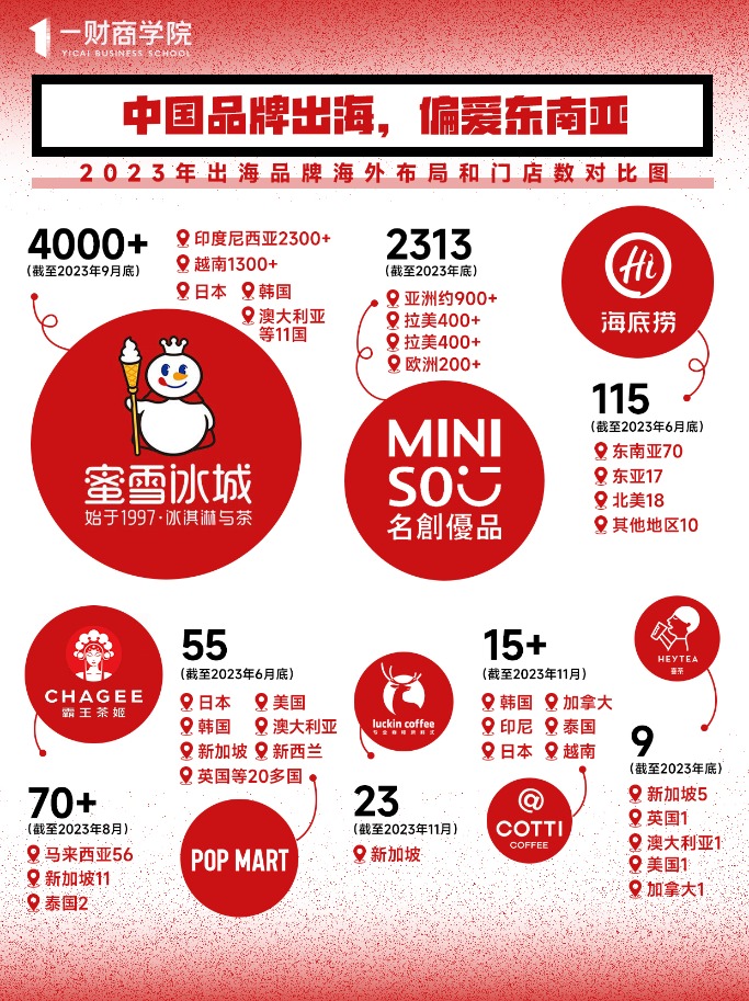 除了电商平台,餐饮等娱乐品牌也纷纷在2023年加快了布局海外的速度和密度。东南亚国家往往是第一站,品牌们在这里站稳脚跟,再向欧美发达国家的核心城市扩张。这种路径选择的逻辑不难理解:东南亚地区华人文化根基深厚,文化氛围与国内相近;在地理上靠近中国,商品和原材料运输成本更低。