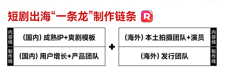 以前的热门出海剧,如《还珠格格》、《甄嬛传》,往往是作品先在国内大获成功,再直接翻译出口。现在以枫叶互动为代表制作的海外爆款短剧,已经进化出国内和海外配合的“一条龙”制作链条——内容上用国内爆款爽剧模板,套上海外观众欢迎的文化元素和本土演员;制作上国内团队负责产品和用户运营,海外团队完成拍摄和发行。
