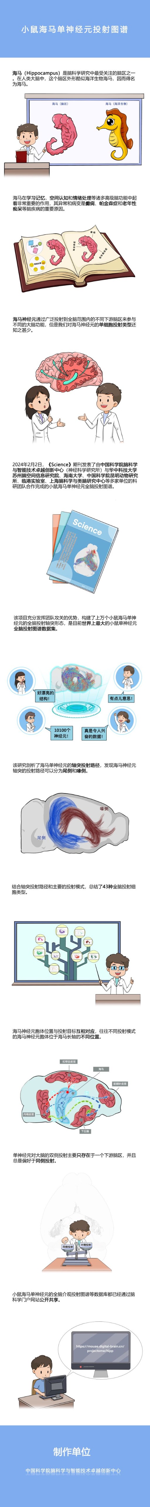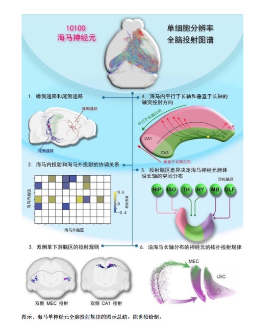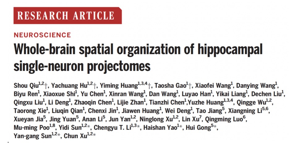 随着科学研究的推进,海马脑区的功能研究也在不断拓展。2月2日,《科学》期刊在线发表了题为《Whole-brain spatial organization of hippocampal single-neuron projectomes》的研究论文。该研究解析了海马神经元的空间联接规律,并建立了小鼠海马脑区单神经元的全脑介观投射联接图谱的数据库,也是目前世界上最大的单神经元全脑投射图谱数据集。