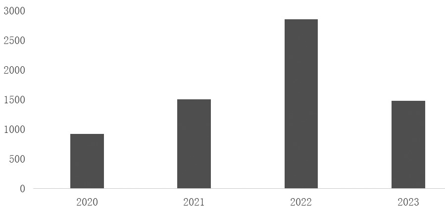 图为2020—2023年定向饲用稻谷成交量(单位:万吨)