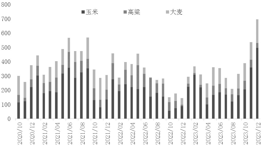 除了价格方面,就进口谷物到港节奏来看,我们评估2024年一季度进口谷物到港量将明显下降,进口谷物对国产玉米市场的冲击也会趋弱。参考中国海关统计数据,2023年10—12月我国进口玉米、高粱、大麦合计到港量分别为388万吨、535万吨、696万吨。无论是季环比还是同比来看,2023年四季度我国进口谷物到港量都处于相对高位。由于进口谷物集中到港,饲料企业在配方中优先采用进口谷物作为饲用原料,减少了玉米在饲料配方中的添加比例。以广东区域谷物提货量为例,根据统计,2023年10—12月国产玉米提货量分别为41万吨、47万吨、57万吨,同比减少量分别为3万吨、15万吨、29万吨。与此对照的是,2023年10—12月进口谷物(玉米、高粱、大麦)合计提货量分别为125万吨、122万吨、132万吨,同比增加量分别为25万吨、51万吨、67万吨。