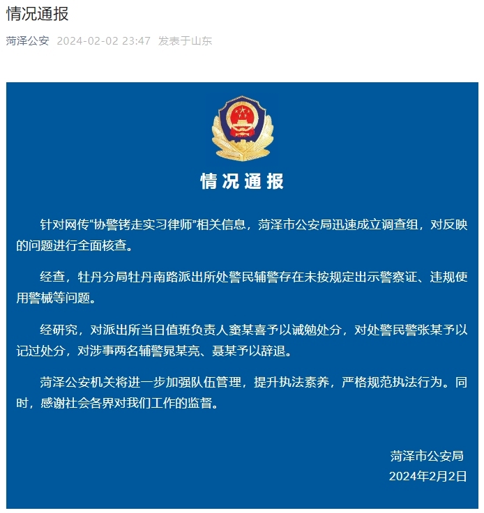 新京报讯 2月2日,菏泽市公安局发布情况通报称,针对网传“协警铐走实习律师”相关信息,菏泽市公安局迅速成立调查组,对反映的问题进行全面核查。