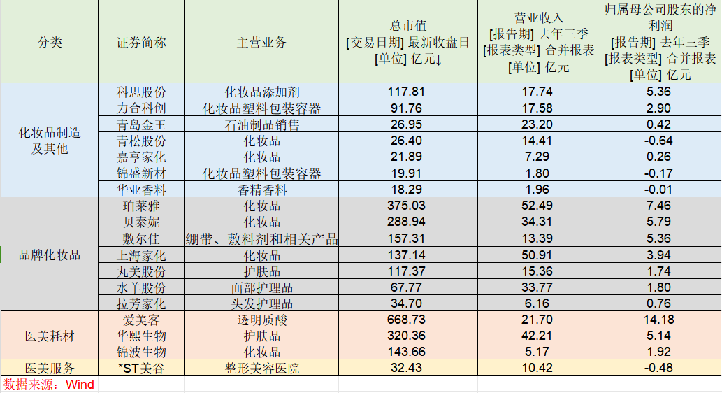 其中,品牌化妆品上市企业有7家,分别为水羊股份、贝泰妮、敷尔佳、上海家化、珀莱雅、拉芳家化、丸美股份;化妆品制造及其他企业有7家,分别为青岛金王、力合科创、青松股份、锦盛新材、科思股份、华业香料、嘉亨家化。此外,医美耗材领域有3家上市公司,分别为爱美客、华熙生物、锦波生物;医美服务为1家,为*ST美谷。