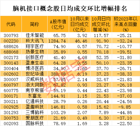 在股价处于低位区间,成交量放大意味着资金大量进入,后续反弹概率较高。进入10月份,多只脑机接口概念股成交趋向活跃。数据宝统计,10月以来日均成交环比提升的脑机接口概念股有17只,占比58.62%。佳禾智能、科大讯飞、翔宇医疗、热景生物、创新医疗、盈康生命等日均成交环比提升幅度均超50%。